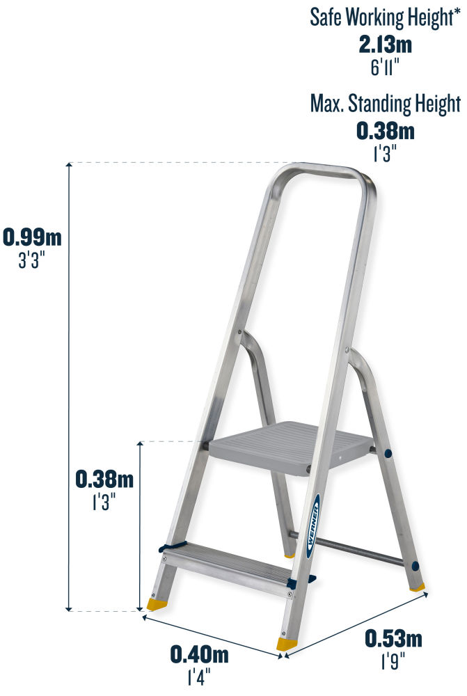 Designed to provide maximum comfort for the user, the Werner 2 tread aluminium stepladder features a large platform that provides a secure and comfortable work area and a high handrail for added stability whilst using the ladder. A platform height of 0.38m enables a safe working height of 2.13m* so this ladder is ideal for those just-out-of-reach areas. Approved to the latest EN131 standard. For Professional Use.